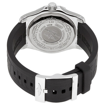 Stainless steel case with a black rubber strap. Uni-directional rotating stainless steel bezel. Volcano black dial with luminous silver-tone hands and index hour markers. 24 hour markers. Minute markers around the outer rim. Dial Type: Analog. Luminescent hands and markers. Date display at the 3 o'clock position. Breitling calibre 32 automatic movement with a 42-hour power reserve. Scratch resistant sapphire crystal. Screw locked crown. Solid case back. Round case shape. Case size: 43 mm. Case thickness: 12.2 mm. Band width: 22 mm. Tang clasp. Water resistant at 300 meters / 1000 feet. Functions: date, hour, minute, second, 24 hour. Luxury watch style. Watch label: Swiss Made. Breitling Avenger II GMT Automatic Men's Watch A32390111B1S2.