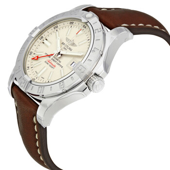 Stainless steel case with a brown leather strap. Bi-directional rotating stainless steel bezel. Silver dial with luminous silver-tone hands and index hour markers. Minute markers. 24 hour markers around the outer rim. Dial Type: Analog. Luminescent hands and markers. Date display at the 3 o'clock position. Breitling calibre 32 automatic movement with a 42-hour power reserve. Scratch resistant sapphire crystal. Screw locked crown. Solid case back. Case size: 43 mm. Case thickness: 12.20 mm. Round case shape. Band width: 22 mm / 20 mm. Tang clasp. Water resistant at 300 meters / 1000 feet. Functions: date, GMT, second time zone, hour, minute, second. Luxury watch style. Watch label: Swiss Made. Breitling Avenger II GMT Automatic Silver Dial Men's Watch A3239011-G778BRLT.