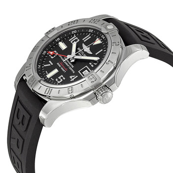 Stainless steel case with a black rubber strap. Uni-directional rotating stainless steel bezel. Black dial with luminous hands and Arabic numeral hour markers. Minute markers. 24 hour (GMT) scale appears around the outer rim. Dial Type: Analog. Luminescent hands and markers. Date display at the 3 o'clock position. Automatic movement with 42 hour power reserve. Scratch resistant sapphire crystal. Screw locked crown - two gaskets. Solid case back. Case diameter: 43 mm. Case thickness: 16.5 mm. Round case shape. Band width: 20 mm / 22 mm. Deployment clasp. Water resistant at 300 meters / 1000 feet. Functions: GMT, second time zone, hour, minute, second, date. Luxury watch style. Watch label: Swiss Made. Breitling Avenger II GMT Black Dial Black Rubber Automatic Men's Watch A3239011-BC34BKPD3.