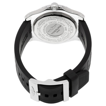 Stainless steel case with a black (diver pro III) rubber strap. Bi-directional rotating stainless steel bezel. Back dial with luminous silver-tone hands and Arabic numeral hour markers. Minute markers. 24 hour markers around the outer rim. Dial Type: Analog. Luminescent hands and markers. Date display at the 3 o'clock position. Automatic movement with a 42 hour power rerserve. Scratch resistant sapphire crystal. Screw locked crown. Solid case back. Case diameter: 43 mm. Case thickness: 12.20 mm. Round case shape. Band width: 22 mm / 20 mm. Tang clasp. Water resistant at 300 meters / 1000 feet. Functions: GMT, second time zone, hour, minute, second. Luxury watch style. Watch label: Swiss Made. Item Variations: A3239011/BC34 152S-A20S.1. Breitling Avenger II GMT Black Dial Black Rubber Men's Watch A3239011-BC34BKPT3.
