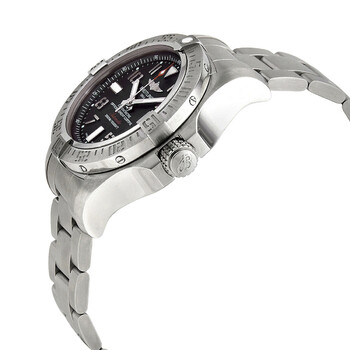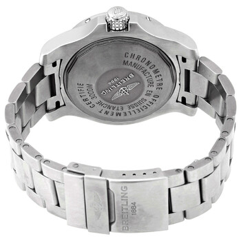 Stainless steel case with a stainless steel bracelet. Uni-directional rotating stainless steel bezel. Black dial with luminous silver-tone hands and Arabic numeral hour markers. Minute markers. 1/100th second scale around the outer rim. Dial Type: Analog. Luminescent hands and markers. Date display at the 3 o'clock position. Breitling calibre 17 automatic movement, based upon ETA 2824-2, containing 25 Jewels, bitting at 28800 vph, and has a power reserve of approximately 42 hours. Scratch resistant sapphire crystal. Screw locked - two gaskets crown. Solid case back. Round case shape. Case size: 45 mm. Case thickness: 18.4 mm. Band width: 22 mm. Band length: 8.5 inches. Fold over clasp with a safety release. Water resistant at 3000 meters / 10000 feet. Functions: chronometer, date, hour, minute, second. Avenger II Seawolf Series. Dive watch style. Watch label: Swiss Made. Breitling Avenger II Seawolf Automatic Chronometer Black Dial Men's Watch BC31/169A.