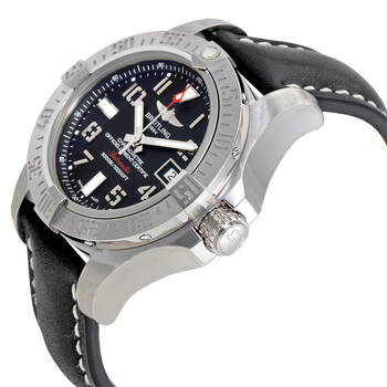 Stainless steel case with a black leather strap. Uni-directional rotating stainless steel bezel. Black dial with luminous silver-tone hands and Arabic numeral hour markers. Minute markers. 1/100th markers around the outer rim. Dial Type: Analog. Luminescent hands and markers. Date display at the 3 o'clock position. Breitling calibre 17 automatic movement with a 40-hour power reserve. Scratch resistant sapphire crystal. Screw locked crown. Solid case back. Case size: 45 mm. Case thickness: 18.40 mm. Round case shape. Band width: 22 mm / 20 mm. Tang clasp. Water resistant at 3000 meters / 10000 feet. Functions: date, hour, minute, second. Luxury watch style. Watch label: Swiss Made. Breitling Avenger II Seawolf Automatic Men's Wach A1733110-BC31BKLT.