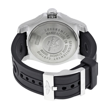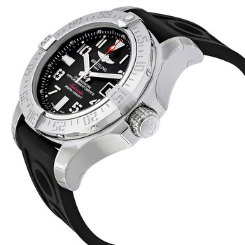 Stainless steel case with a black ocean racer rubber strap. Uni-directional rotating stainless steel bezel. Black dial with silver-tone hands and luminous Arabic numeral hour markers. Minute markers. 1/100th second scale around the outer rim. Dial Type: Analog. Luminescent hands and markers. Date display at the 3 o'clock position. Breitling 17 automatic movement with a 40-hour power reserve. Scratch resistant sapphire crystal. Screw locked crown - two gaskets. Solid case back. Case size: 45 mm. Case thickness: 18.45 mm. Round case shape. Band width: 22 mm / 20 mm. Tang clasp. Water resistant at 3000 meters / 10000 feet. Functions: date, hour, minute, second. Luxury watch style. Watch label: Swiss Made. Breitling Avenger II Seawolf Automatic Men's Watch A1733110-BC31BKORT.