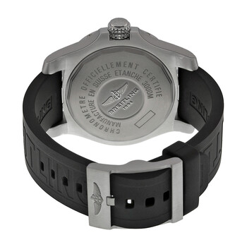 Stainless steel case with a black (Diver Pro III) rubber strap. Uni-directional rotating stainless steel bezel. Black dial with luminous silver-tone hands and Arabic numeral hour markers. Minute markers. 1/100 scale markers around the outer rim. Dial Type: Analog. Luminescent hands and markers. Date display at the 3 o'clock position. Breitling calibre 17 automatic movement with a 40-hour power reserve. Scratch resistant sapphire crystal. Screw locked - two gaskets crown. Solid case back. Case size: 45 mm. Case thickness: 18.4 mm. Round case shape. Band width: 22 mm / 20 mm. Band length: 8.5 inches. Tang clasp. Water resistant at 3000 meters / 10000 feet. Functions: date, hour, minute, second. Luxury watch style. Watch label: Swiss Made. Item Variations: A1733110 BC31BKPT3, A1733110.BC31BKPT3, A1733110BC31BKPT3. Breitling Avenger II Seawolf Automatic Men's Watch A1733110-BC31BKPT3