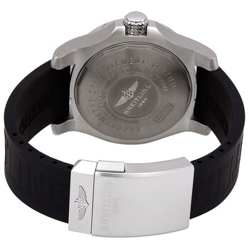 Stainless steel case with a black rubber strap. Fixed stainless steel bezel. Black dial with luminous silver-tone hands and Arabic numeral hour markers. Minute markers. 100th second markers around the outer rim. Dial Type: Analog. Luminescent hands and markers. Date display at the 3 o'clock position. Calibre 17 quartz movement with a 42-hour power reserve. Scratch resistant sapphire crystal. Screw locked crown. Solid case back. Round case shape. Case size: 45 mm. Case thickness: 18.4 mm. Band width: 22 mm. Deployment clasp. Water resistant at 3000 meters / 10000 feet. Functions: date, hour, minute, second. Luxury watch style. Watch label: Swiss Made. Breitling Avenger II Seawolf Automatic Black Dial Men's Watch A17331101B1S1.