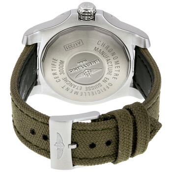 Stainless steel case with a green canvas strap. Uni-directional rotating stainless steel bezel. Yellow dial with luminous silver-tone hands and Arabic numeral hour markers. Minute markers. 1/100th markers around the outer rim. Dial Type: Analog. Luminescent hands and markers. Date display at the 3 o'clock position. Automatic movement with a 40-hour power reserve. Scratch resistant sapphire crystal. Screw locked crown - two gaskets. Solid case back. Case size: 45 mm. Case thickness: 18.40 mm. Round case shape. Band width: 22 mm / 20 mm. Tang clasp. Water resistant at 3000 meters / 10000 feet. Functions: date, hour, minute, second. Luxury watch style. Watch label: Swiss Made. Breitling Avenger II Seawolf Yellow Dial Men's Watch A1733110-I519GCVT.