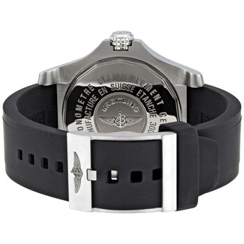 Stainless steel case with a black rubber (diver pro) strap. Unidirectional stainless steel bezel. Black dial with luminous hands and Arabic numeral hour markers. Minute markers. 1/100 second scale. Dial Type: analog. Date display appears at the 3 o'clock position. Automatic chronometer movement. Scratch resistant sapphire crystal. Screw-locked crown with two gaskets. Solid case back. Case diameter: 44 mm. Case thickness: 18 mm. Tang clasp. Water resistant at 3000 meters/ 10000 feet. Functions: hours, minutes, seconds, calendar. Luxury watch style. Breitling Avenger Seawolf Black Dial Automatic Men's Watch A1733010-B906BKPT.