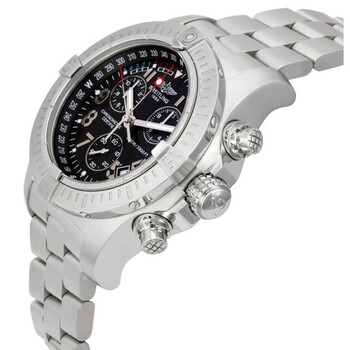 Steel case with a steel bracelet. Unidirectional ratcheting steel bezel. Black dial with luminous hands and Arabic numeral hour markers. Compass on the outer rim. Luminescent hands and dial markers. Date display between the 4 and 5 o'clock positions. Three - 60 minutes, 12 hours and 1/10th of a second. Superquartz movement. Scratch resistant cambered sapphire crystal. Screw locked crown with two gaskets Screwed in case back. Case diameter: 45.4 mm. Case thickness: 18 mm. Deployment clasp. Water resistant at 1000 meters / 3300 feet. Functions: hour, minutes, seconds, date, chronograph, flyback hand, luminescent mobile hour marker. Breitling Avenger Seawolf Chrono Men's Watch A7339010-B9-147A.