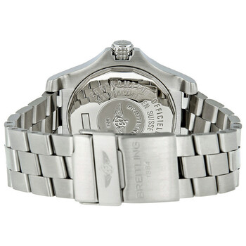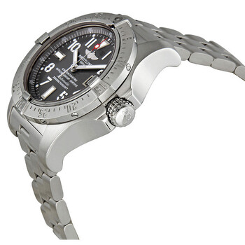 Stainless steel case with a stainless steel link bracelet. Uni-directional rotating bezel. Slate grey dial with luminous hands and index hour markers. 1/100th second scale appears around the outer rim. Dial Type: analog. Date display appears at the 3 o'clock position. Automatic movement. Scratch resistant sapphire crystal. Case diameter: 45.4 mm. Case thickness: 18 mm. Deployment clasp. Water resistant at 3000 meters /10000 feet. Functions: hours, minutes, seconds, date. Luxury watch style. Breitling Avenger Seawolf Slate Grey Dial Automatic Men's Watch A1733010-F538SS.