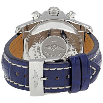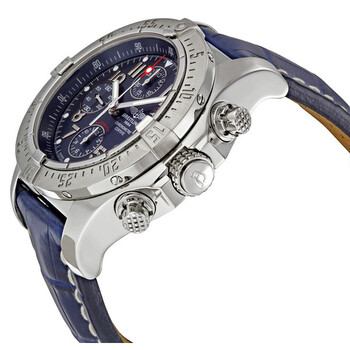 Stainless steel case with a blue crocodile strap. Unidirectional rotating ratcheted bezel. Blue dial with luminous hands and luminous numbers hour markers. Minute markers. 1/100th scale around the inner bezel. Luminescent hands and dial markers. Date display at 3 o'clock position. Chronograph - three sub-dials displaying: 60 seconds, 30 minutes and 12 hours . Automatic movement. Scratch resistant sapphire crystal. Case diameter: 45 mm. Case thickness: 17 mm. Tang clasp. Water resistant at 300 meters / 1000 feet. Functions: hours, minutes, seconds, date, chronograph, tachymeter.