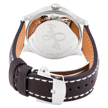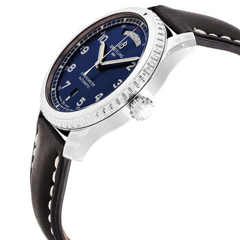 Silver-tone stainless steel case with a black (calfskin) leather strap. Bi-directional rotating coin edge silver-tone stainless steel bezel. Blue dial with luminous silver-tone hands and Arabic numeral hour markers. Minute markers around the outer rim. Dial Type: Analog. Luminescent hands and markers. Date display at the 6 o'clock position. day of the week display centered on the 12 o'clock position. Breitling Calibre 45 Automatic movement, based upon ETA 2834-2, containing 25 Jewels, bitting at 28800 vph, and has a power reserve of approximately 42 hours. Scratch resistant sapphire crystal. Screw locked crown. Solid case back. Round case shape, case size: 41 mm, case thickness: 11.19 mm. Band width: 21 mm. Tang clasp. Water resistant at 100 meters / 330 feet. Functions: date, day, hour, minute, second, chronometer. Aviator 8 Series. Luxury watch style. Watch label: Swiss Made. Breitling Aviator 8 Automatic Chronometer Blue Dial Men's Watch A45330101C1X4.