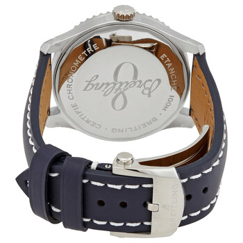 Silver-tone stainless steel case with a blue (calfskin) leather strap. Bi-directional rotating coin edge silver-tone stainless steel bezel. Blue dial with luminous silver-tone hands and Arabic numeral hour markers. Minute markers around the outer rim. Dial Type: Analog. Luminescent hands and markers. Date display at the 6 o'clock position. day of the week display at the 12 op'clock position. Breitling Calibre 45 Automatic movement, based upon ETA 2834-2, containing 25 Jewels, bitting at 28800 vph, and has a power reserve of approximately 42 hours. Scratch resistant sapphire crystal. Screw locked crown. Solid case back. Round case shape, case size: 41 mm, case thickness: 11.19 mm. Band width: 21 mm. Fold over clasp. Water resistant at 100 meters / 330 feet. Functions: date, day, hour, minute, second, chronometer. Aviator 8 Series. Luxury watch style. Watch label: Swiss Made. Breitling Aviator 8 Automatic Chronometer Blue Dial Men's Watch A45330101C1X5.