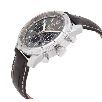 Stainless steel case with a black (alligator) leather strap. Bi-directional rotating stainless steel bezel. Anthracite dial with luminous silver-tone hands and Arabic numeral hour markers. Minute markers the around the outer rim. Dial Type: Analog. Luminescent hands and markers. Date display between the 4 and 5 o'clock positions. Chronograph - three black sub-dials displaying: 60 second, 30 minute and 12 hour. Breitling calibre 01 automatic movement, containing 47 Jewels, composed of 346 parts, bitting at 28800 vph, and has a power reserve of approximately 70 hours. Scratch resistant sapphire crystal. Screw locked crown. Transparent case back. Round case shape. Case size: 43 mm. Case thickness: 13.97 mm. Band width: 23 mm / 20 mm. Deployment buckle clasp. Water resistant at 100 meters / 330 feet. Functions: chronograph, column wheel, date, hour, minute, second, chronometer. Aviator 8 Series. Pilot watch style. Watch label: Swiss Made. Breitling Aviator 8 Chronograph Automatic Anthracite Dial Men's Watch AB0119131B1P2.