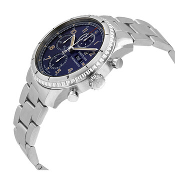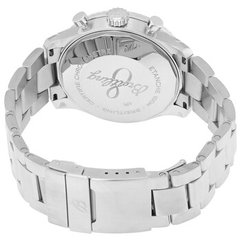 Stainless steel case with a stainless steel bracelet. Bi-directional rotating stainless steel bezel. Blue dial with luminous silver-tone hands and Arabic numeral hour markers. Arabic numeral minute markers (at 5 minute intervals). Minute markers around the outer rim. Dial Type: Analog. Luminescent hands and markers. Day of the week and date display at the 3 o'clock position. Chronograph - three sub-dials displaying: 60 seconds, 30 minutes, and 12 hours. Breitling calibre 13 automatic movement, based upon ETA Valjoux 7750, containing 25 Jewels, bitting at 28800 vph, and has a power reserve of approximately 42 hours. Scratch resistant sapphire crystal. Screw locked crown. Solid case back. Round case shape. Case size: 43 mm. Case thickness: 14.17 mm. Band width: 23 mm. Fold over clasp with a safety release. Water resistant at 100 meters / 330 feet. Functions: chronograph, date, day, hour, minute, second, chronometer. Pilot watch style. Watch label: Swiss Made. Breitling Aviator 8 Chronograph Automatic Chronometer Blue Dial Men's Watch A13316101C1A1.