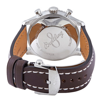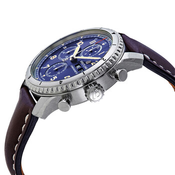 Stainless steel case with a brown (calfskin) leather strap. Bi-directional rotating stainless steel bezel. Blue dial with luminous silver-tone hands and Arabic numeral hour markers. Minute markers around the outer rim. Dial Type: Analog. Luminescent hands and markers. Day of the week and date display at the 3 o'clock position. Chronograph - three sub-dials displaying: 60 seconds, 30 minutes, and 12 hours. Breitling calibre 13 automatic movement, based upon ETA Valjoux 7750, containing 25 Jewels, bitting at 28800 vph, and has a power reserve of approximately 42 hours. Scratch resistant sapphire crystal. Screw locked crown. Solid case back. Round case shape. Case size: 43 mm. Case thickness: 14.17 mm. Band width: 23 mm. Deployment clasp. Water resistant at 100 meters / 330 feet. Functions: chronograph, date, day, hour, minute, second, chronometer. Pilot watch style. Watch label: Swiss Made. Breitling Aviator 8 Chronograph Automatic Chronometer Blue Dial Men's Watch A13316101C1X4.