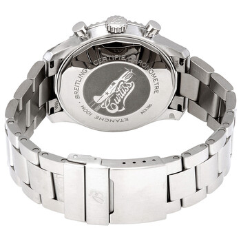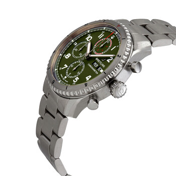 Stainless steel case with a 1 stainless steel bracelet. Bi-directional rotating stainless steel bezel. Green dial with luminous silver-tone hands and Arabic numeral hour markers. Arabic numeral minute markers (at 5 minute intervals). Minute markers around the outer rim. Dial Type: Analog. Luminescent hands and markers. Day of the week and date display at the 3 o'clock position. Chronograph - three sub-dials displaying: 60 second, 30 minute and 12 hour. Breitling calibre 13 automatic movement, based upon ETA Valjoux 7750, containing 25 Jewels, bitting at 28800 vph, and has a power reserve of approximately 42 hours. Scratch resistant sapphire crystal. Screw locked crown. Solid case back. Round case shape. Case size: 43 mm. Case thickness: 14.17 mm. Band width: 23 mm. Deployment clasp with push button release. Water resistant at 100 meters / 330 feet. Functions: chronograph, date, day, hour, minute, second, chronometer. Aviator 8 Series. Pilot watch style. Watch label: Swiss Made. Breitling Aviator 8 Chronograph Curtiss Warhawk Automatic Green Dial Men's Watch A133161A1L1A1.