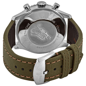 Stainless steel case with a khaki green fabric strap. Bi-directional rotating stainless steel bezel. Green dial with luminous hands and Arabic numeral hour markers. Minute markers around the outer rim. Dial Type: Analog. Luminescent hands and markers. Day of the week and date display at the 3 o'clock position. Chronograph - three sub-dials displaying: 60 seconds, 30 minutes, and 12 hours. Breitling calibre 13 automatic movement, based upon ETA Valjoux 7750, containing 25 Jewels, bitting at 28800 vph, and has a power reserve of approximately 42 hours. Scratch resistant sapphire crystal. Screw locked crown. Solid case back. Round case shape. Case size: 43 mm. Case thickness: 14.17 mm. Band width: 23 mm. Tang clasp. Water resistant at 100 meters / 330 feet. Functions: chronograph, date, day, hour, minute, second, chronometer. Pilot watch style. Watch label: Swiss Made. Breitling Aviator 8 Curtiss Warhawk Chronograph Automatic Green Dial Men's Watch A133161A1L1X1.
