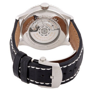 Silver-tone stainless steel case with a black alligator/crocodile leather strap. Bi-directional rotating silver-tone bezel. Black dial with silver-tone hands and Arabic numeral hour markers. Dial Type: Analog. Luminescent hands and markers. Date display at the 6 o'clock position. Breitling Calibre 35 Automatic movement, based upon ETA 2892-A2, containing 38 Jewels, bitting at 28800 vph, and has a power reserve of approximately 70 hours. Scratch resistant sapphire crystal. Screw down crown. Transparent case back. Round case shape, case size: 43 mm, case thickness: 14.55 mm. Push button deployant buckle clasp. Water resistant at 100 meters / 330 feet. Functions: date, GMT, second time zone, hour, minute, second, chronometer. Aviator 8 - Navitimer 8 Series. Luxury watch style. Watch label: Swiss Made. Breitling Aviator 8 - Navitimer 8 Automatic Chronometer Black Dial Men's Watch AB3521U41B1P2.