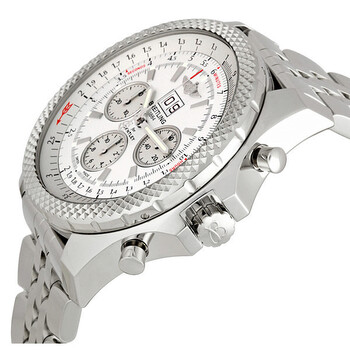 . Stainless steel case with a stainless steel bracelet. Bidirectional rotating stainless steel bezel. Silver dial with silver-tone luminous hands and index hour markers. Minute markers. Slide rule markings around the outer rim. Dial Type: Analog. Luminescent super-luminova luminescent. Date display below the 12 o'clock position. Chronograph - three sub-dials displaying: 60 second, 30 minute and 12 hour. Automatic movement with a 42 hour power reserve. Scratch resistant anti-reflective saphire crystal. Screw locked crown. Solid case back. Case diameter: 48.70 mm. Case thickness: 16.5 mm. Round case shape. Band width: 24 mm. Deployment clasp. Water resistant at 100 meters/ 330 feet. Functions: hours, minutes, seconds, date, chronograph, tachymeter. Sport watch style. Watch label: Swiss made. Additional Information: "Slide Rule" aka "Navigation Computer" which allows to compute different airborne calculations such as fuel consumption, climbing times & converting miles into nautical miles or kilometers. Breitling Bentley 6.75 Stainless Steel Men's Watch A4436412-G679SS.