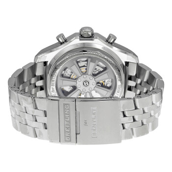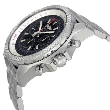 Stainless steel case with a stainless steel bracelet. Fixed stainless steel bezel. Black dial with luminous hands and index hour markers. 24 hour markings. Minute markers. Tachymeter markings around the outer rim. Dial Type: Analog. Luminescent hands and markers. Date display between 4 and 5 o'clock positions. Chronograph - three sub-dials displaying: 60 second, 30 minute and 12 hour. Automatic movement with a 70 hour power reserve. Scratch resistant sapphire crystal. Screw locked crown. Skeleton case back. Case diameter: 49 mm. Case thickness: 17 mm. Round case shape. Deployment clasp. Water resistant at 100 meters / 330 feet. Functions: chronograph, date, hour, minute, second. Luxury watch style. Watch label: Swiss Made. Breitling Bentley B04 GMT Chronograph Men's Watch AB043112-BC69SS.