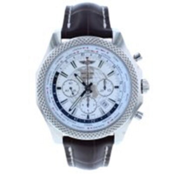 Stainless steel case with a brown alligator band. Bi-directional rotating slide rule stainless steel bezel. White dial with index hour markers. Minute markers. 24 hour markings. world time around the outer rim. Dial Type: Analog. Luminescent hands and markers. Date display between the 4 and 5 o'clock positions. Chronograph - three sub-dials displaying: 60 second, 30 minute and 12 hour. Breitling Calibre 05 automatic movement with a 70-hour power reserve. Scratch resistant sapphire crystal. Screw locked crown. Skeleton case back. Round case shape, case size: 49 mm, case thickness: 17 mm. Deployment clasp. Water resistant at 100 meters / 330 feet. Functions: chronograph, column wheel, world time, date, hour, minute, small second, chronometer. Luxury watch style. Watch label: Swiss Made. Breitling Bentley B05 Unitime World Time Chronograph Automatic Chronometer White Dial Men's Watch AB0521U0/A768-757P.