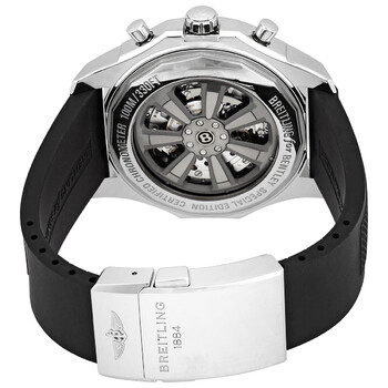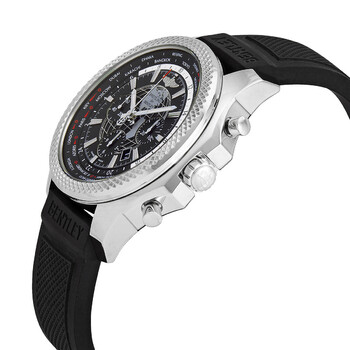 Stainless steel case with a black rubber strap. Bi-directional rotating stainless steel bezel. Royal ebony (globe) dial with luminous silver-tone hands and index hour markers. Minute markers. Rotating 24 hour markings. World time cities around the outer rim. Dial Type: Analog. Luminescent hands and markers. Date display between the 4 and 5 o'clock positions. Chronograph - three sub-dials displaying: 60 second, 30 minute and 12 hours. Breitling calibre 05 Automatic movement, based upon Breitling calibre 01, containing 56 Jewels, bitting at 28800 vph, and has a power reserve of approximately 70 hours. Scratch resistant sapphire crystal. Screw locked crown. Transparent case back. Round case shape. Case size: 49 mm. Case thickness: 17 mm. Fold over clasp. Water resistant at 100 meters / 330 feet. Functions: chronograph, date, hour, minute, second, world time. Bentley B05 Unitime Series. Luxury watch style. Watch label: Swiss Made. Breitling Bentley B05 Unitime World Time Chronograph Automatic Men's Watch AB0521U4-BD79-220S.A20D.2.