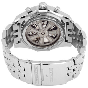 Stainless steel case and bracelet. Bi-directional rotating stainless steel bezel. Black dial with index hour markers. Minute markers. Slide rule markings around the outer rim. Dial Type: Analog. Luminescent hands and markers. Date display between 4 and 5 o'clock position. Chronograph - three sub-dials displaying: 60 second, 15 minute and 6 hour. Breitling Calibre 06 automatic movement, based upon Breitling calibre 01, containing 47 Jewels, bitting at 28000 vph, and has a power reserve of approximately 70 hours. Scratch resistant sapphire crystal. Screw locked crown. Transparent case back. Round case shape. Case size: 49 mm. Case thickness: 16.5 mm. Band width: 22 mm / 24 mm. Deployment clasp. Water resistant at 100 meters / 330 feet. Functions: chronograph, date, hour, minute, second. Bentley B06 Series. Luxury watch style. Watch label: Swiss Made. Breitling Bentley B06 Chronograph Automatic Black Dial Men's Watch AB061112/BD80 990A.