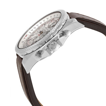 Stainless steel case with a brown leather strap. Bi-directional rotating stainless steel bezel. Silver dial with luminous silver-tone hands and index hour markers. Minute markers. Tachymeter markings around the outer rim. Dial Type: Analog. Luminescent hands and markers. Date display between the 4 and 5 o'clock positions. Chronograph - three sub-dials displaying: 1/8th of a second,30-second, 15-minute and 6-hour totalizers. Breitling calibre B06 automatic movement. Scratch resistant sapphire crystal. Screw down crown. Transparent case back. Round case shape. Case size: 49 mm. Tang clasp. Water resistant at 100 meters / 330 feet. Functions: chronograph, tachymeter, date, hour, minute, second. Bentley B06 Series. Luxury watch style. Watch label: Swiss Made. Breitling Bentley B06 Chronograph Automatic Silver Dial Men's Watch AB061112-G802-479X.