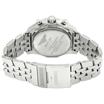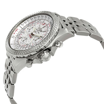 Silver-tone stainless steel case with a silver-tone stainless steel bracelet. Bi-directional rotating slide rule silver-tone stainless steel bezel. Silver dial with luminous silver-tone hands and index hour markers. Minute markers. 30 second markers. slide rule markings around the outer rim. Dial Type: Analog. Luminescent hands and markers. Date display between the 4 and 5 o'clock positions. Chronograph - three sub-dials displaying: 60 second, 15 minute and 6 hours. Breitling Calibre 06 Automatic movement, based upon Breitling Calibre 01, containing 47 Jewels, bitting at 28000 vph, and has a power reserve of approximately 70 hours. Scratch resistant sapphire crystal. Screw locked crown. Solid case back. Round case shape, case size: 44 mm. Band width: 22 mm. Deployment with push button release clasp. Water resistant at 100 meters / 330 feet. Functions: chronograph, date, hour, minute, second. Bentley B06 S Series. Luxury watch style. Watch label: Swiss Made. Breitling Bentley B06 S Chronograph Automatic Silver Dial Men's Watch AB061221/G810-980A.