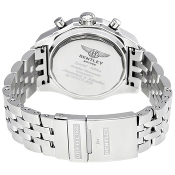 Stainless steel case with a stainless steel bracelet. Bi-directional rotating stainless steel bezel. Black dial with luminous silver-tone hands and index hour markers. An Arabic numeral appears at the 12 o'clock position. Minute markers. Tachymeter scale around the outer rim. Dial Type: Analog. Luminescent hands and markers. Date display between the 4 and 5 o'clock positions. Chronograph - three sub-dials displaying: 60 second, 30 minute and 12 hour. Breitling calibre 41 automatic movement with a 42-hour power reserve. Scratch resistant sapphire crystal. Screw locked crown. Solid case back. Case size: 42 mm. Case thickness: 14 mm. Round case shape. Band width: 21 mm. Deployment clasp. Water resistant at 100 meters / 330 feet. Functions: chronograph, date, hour, minute, second, nautical miles conversion scale. Luxury watch style. Watch label: Swiss Made. Item Variations: A4139024 BC83, A4139024.BC83, A4139024BC83. Breitling Bentley Barnato Automatic Black Dial Men's Watch A4139024-BC83.
