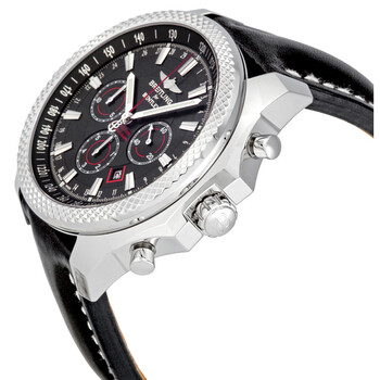 Stainless steel case with a black leather strap with contrast stiching. Bidirectional stainless steel bezel. Black dial with luminous hands and index hour markers. Minute markers. Tachymeter scale appears around the outer rim. Dial Type: analog. Date display appears between the 4 and 5 o'clock position. Chronograph - three sub-dials displaying: 60 minutes, 15 minutes and 6 hour totalizer. Automatic movement. Scratch resistant sapphire crystal. Screw locked crown. Skeleton case back. Case diameter: 49 mm. Deployment clasp. Water resistant at 100 meters/ 330 feet. Functions: hours, minutes, seconds, date, chronograph, tachymeter. Luxury Sport watch style. Breitling Bentley Barnato Black Dial Chronograph Men's Watch A2536824-BB11BKLD.