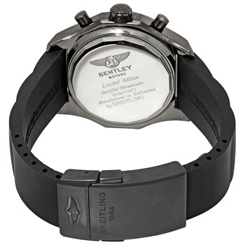 Black stainless steel case with a black rubber strap. Bi-directional rotating black stainless steel bezel. Black diamond-set dial with luminous gunmetal hands and diamond-set index hour markers. An Arabic numeral appears at the 12 o'clock position. Minute markers around the outer rim. Dial Type: Analog. Luminescent hands. Date display between the 4 and 5 o'clock positions. Chronograph - three sub-dials displaying: 60 second, 30 minute and 12 hours. Breitling calibre 41B automatic movement. Scratch resistant sapphire crystal. Screw locked crown. Solid case back. Round case shape. Case size: 42 mm. Case thickness: 14 mm. Band width: 21 mm. Deployment clasp with a push button release. Water resistant at 100 meters / 330 feet. Functions: chronograph, date, hour, minute, second. Additional Info: limited edition. Luxury watch style. Watch label: Swiss Made. Breitling Bentley Barnato Chronograph Automatic Black Dial Men's Watch M41390AQ/BC44-217S.