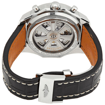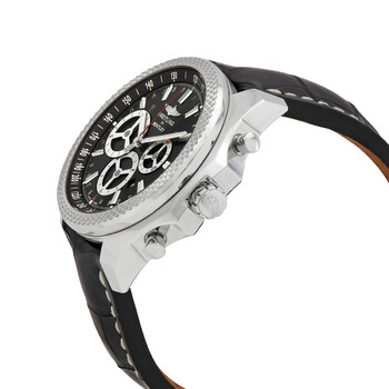 Silver-tone stainless steel case with a black leather strap. Black dial with black hands and index hour markers. Dial Type: Analog. Luminescent hands and markers. Date display between 4 and 5 o'clock position. Automatic movement. Scratch resistant sapphire crystal. Screw down crown. Round case shape, case size: 49 mm. Deployment clasp. Water resistant at 100 meters / 330 feet. Functions: chronograph, date, hour, minute, second. Bentley BarNATO Racing Series. Watch label: Swiss Made. Breitling Bentley BarNATO Racing Chronograph Automatic Black Dial Men's Watch A2536624/BB09.761P.A20D.1.