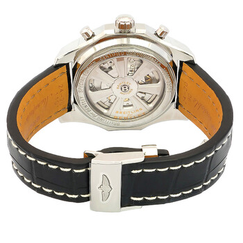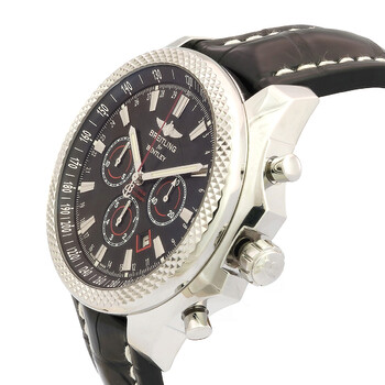 Silver-tone stainless steel case with a black leather strap. Bi-directional rotating bezel. Black dial with silver-tone hands and index hour markers. Dial Type: Analog. Luminescent hands and markers. Date display between 4 and 5 o'clock position. Chronograph - three sub-dials displaying: 60 second, 15 minute and 6 hour. Breitling Calibre 25 Automatic movement, based upon ETA 2892-A2, containing 21 Jewels, bitting at 28800 vph, and has a power reserve of approximately 42 hours. Scratch resistant sapphire crystal. Round case shape, case size: 49 mm. Band width: 24 mm. Deployment clasp. Water resistant at 100 meters / 330 feet. Functions: chronograph, hour, minute, small second. Bentley BarNATO Racing Series. Luxury watch style. Watch label: Swiss Made. Breitling Bentley BarNATO Racing Chronograph Automatic Black Dial Men's Watch A2536824/BB11.761P.A20D.1.