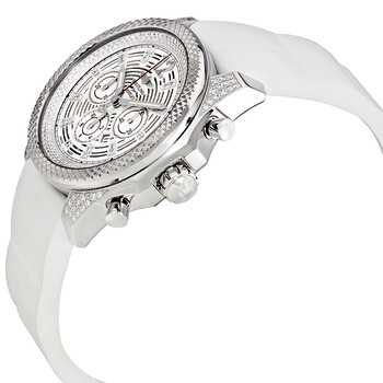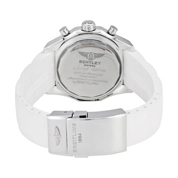 Stainless steel case with a white rubber strap. Diamond-set lugs. Bi-directional rotating stainless steel bezel. Silver dial with luminous silver-tone hands and diamond-set index hour markers. An Arabic numeral appears at the 12 o'clock position. Minute markers around the outer rim. Dial Type: Analog. Luminescent hands. Date display between the 4 and 5 o'clock positions. Chronograph - three sub-dials displaying: 60 second, 30 minute and 12 hour. Breitling calibre 41 automatic movement with a 42-hour power reserve. Scratch resistant sapphire crystal. Pull / push crown. Solid case back. Case size: 42 mm. Round case shape. Deployment clasp. Water resistant at 100 meters / 330 feet. Functions: chronograph, date, hour, minute, second,. Luxury watch style. Watch label: Swiss Made. Breitling Bentley Barnato Silver Automatic Unisex Watch A41390AP-G788WHRD.