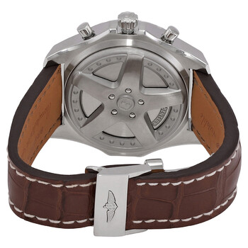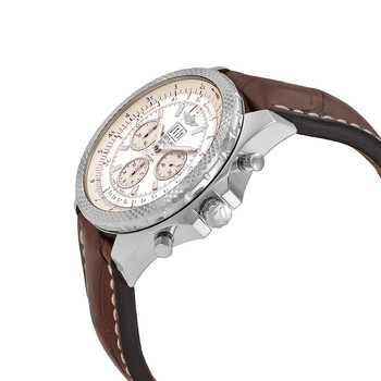 Silver-tone stainless steel case with a brown leather strap. Bi-directional rotating slide rule silver-tone stainless steel bezel. Silver-tone hands and stick hour markers. Minute markers. Tachymeter around the outer rim. Dial Type: Analog. Luminescent hands and markers. Date display at the 12 o'clock position. Chronograph - three sub-dials displaying: 60 second, 30 minute and 12 hour. Breitling Calibre 44 Automatic movement, based upon ETA 2892-A2, containing 21 Jewels, bitting at 28800 vph, and has a power reserve of approximately 42 hours. Scratch resistant sapphire crystal. Screw down crown. Solid case back. Round case shape, case size: 47.8 mm. Band width: 24 mm. Deployment with push button release clasp. Water resistant at 100 meters / 330 feet. Functions: chronograph, date, hour, minute, second, chronometer. Bentley Series. Luxury watch style. Watch label: Swiss Made. Breitling Bentley Chronograph Automatic Chronometer Men's Watch A4436412/G679.757P.A20D.1.