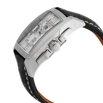 Silver-tone stainless steel case with a black leather strap. Fixed silver-tone stainless steel bezel. Silver dial with silver-tone hands and index hour markers. Roman numeral marks the 12 o'clock position. Minute markers around an inner circle. Dial Type: Analog. Luminescent hands and markers. Date display at the 12 o'clock position. Chronograph - three sub-dials displaying: 60 second, 30 minute and 12 hour. Breitling Calibre 44B Automatic movement, based upon ETA 2892, containing 38 Jewels, bitting at 28800 vph, and has a power reserve of approximately 42 hours. Scratch resistant sapphire crystal. Screw locked crown. Solid case back. Rectangle case shape, case size: 58.20 mm x 38.50 mm, case thickness: 16.5 mm. Deployment clasp. Water resistant at 100 meters / 330 feet. Functions: chronograph, date, hour, minute, second. Bentley Series. Luxury watch style. Watch label: Swiss Made. Breitling Bentley Chronograph Automatic Silver Dial Men's Watch A4436512/G632.757P.A20D.1.
