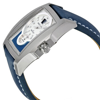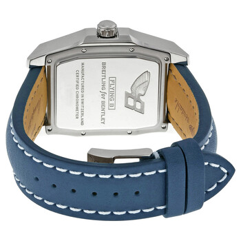 Silver-tone stainless steel case with a blue leather strap. Fixed silver-tone stainless steel bezel. Blue dial with silver-tone hands and stick hour markers. Hour is displayed in a window at the 12 o'clock postion. minute markers around the outer rim. Dial Type: Analog. Date display at the 12 o'clock position. One subdial displaying: small second at the 6 o'clock position. Breitling Calibre 28 Automatic movement, based upon ETA 2892-A2, containing 21 Jewels, bitting at 28800 vph, and has a power reserve of approximately 42 hours. Scratch resistant sapphire crystal. Screw locked crown. Solid case back. Rectangle case shape, case size: 57.3 mm x 38.5 mm, case thickness: 15 mm. Band width: 24 mm. Tang clasp. Water resistant at 50 meters / 165 feet. Functions: date, hour, minute, second. Bentley Series. Luxury watch style. Item Variations: A2836212 C722BLLT, A2836212.C722BLLT, A2836212C722BLLT. Breitling Bentley Flying B Automatic Jumping Hour Blue Dial Men's Watch A2836212-C722BLLT.