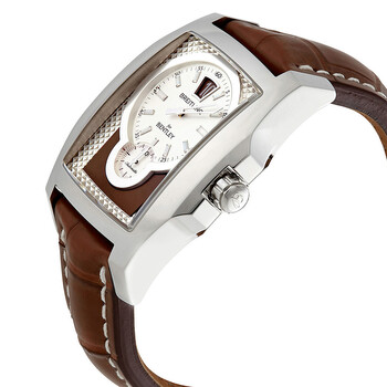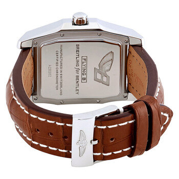 Silver-tone stainless steel case with a brown crocodile leather strap. Fixed silver-tone stainless steel bezel. Silver/bronze dial with skeletal hands and index hour markers. Hour is displayed in a window at the 12 o'clock postion. Dial Type: Analog. Luminescent hands and markers. Date display at the 12 o'clock position. One subdial displaying: small second. Breitling Calibre 28 Automatic movement, based upon ETA 2892-A2, containing 21 Jewels, bitting at 28800 vph, and has a power reserve of approximately 42 hours. Scratch resistant sapphire crystal. Screw locked crown. Solid case back. Rectangle case shape, case size: 57.30 mm x 38.50 mm, case thickness: 15 mm. Deployment clasp. Water resistant at 100 meters / 330 feet. Functions: date, hour, minute, second. Additional Info: hour is displayed in the window at the 12 o'clock position. Bentley Flying B Series. Dress watch style. Watch label: Swiss Made. Breitling Bentley Flying B Automatic Men's Watch A2836212-Q533BRCT.
