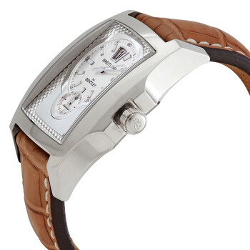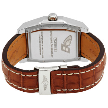 18kt white gold Silver-tone 18kt white gold case with a brown leather strap. Fixed silver-tone 18kt white gold bezel. Silver-tone hands and index hour markers. Minute markers around the outer rim. Dial Type: Analog. Date display at the 12 o'clock position. One subdial displaying: small second. Breitling Calibre 28 Automatic movement, based upon ETA 2892-A2, containing 21 Jewels, bitting at 28800 vph, and has a power reserve of approximately 42 hours. Scratch resistant sapphire crystal. Solid case back. Rectangle case shape, case size: 39 mm. Band width: 15 mm. Tang clasp. Water resistant at 100 meters / 330 feet. Functions: big date, hour, minute, small second. Bentley Flying B Series. Watch label: Swiss Made. Breitling Bentley Flying B Automatic Men's Watch J2836212/A633.755PJ20DNRH.