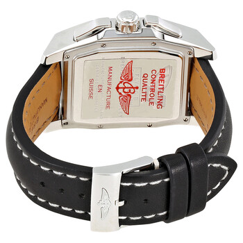 Stainless steel case with a black leather strap. Fixed stainless steel bezel. Silver dial with luminous silver-tone hands and index hour markers. A Roman numeral appears at the 12 o'clock position. Minute markers around the inner ring. Dial Type: Analog. Luminescent hands. Date display below the 12 o'clock position. Chronograph - three sub-dials displaying: 60 second, 30 minute and 12 hour. Breitling calibre 44B automatic movement. Scratch resistant sapphire crystal. Screw down crown. Solid case back. Case dimensions: 58.20 mm x 38.50 mm. Case thickness: 16.5 mm. Rectangle case shape. Tang clasp. Water resistant at 100 meters / 330 feet. Functions: chronograph, date, hour, minute, second. Luxury watch style. Watch label: Swiss Made. Breitling Bentley Flying B Chronograph Automatic Men's Watch A4436512-G632BKLT.