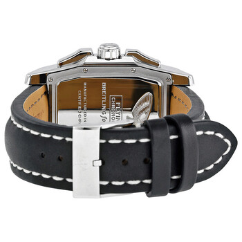 Stainless steel case with a black leather strap. Fixed stainless steel bezel. Black dial with silver-tone inner zone, silver-tone hands and stick hour markers. Roman numeral marks the 12 o'clock position. Minute markers around an inner ring. Dial Type: Analog. Luminescent hands and markers. Date display appears at the 12 o'clock position. Chronograph - three sub-dials displaying: 60 second, 30 minute and 12 hour. Automatic movement. Scratch resistant sapphire crystal. Screw locked crown. Solid case back. Case dimensions: 58.20 mm x 38.50 mm. Case thickness: 16.5 mm. Rectangle case shape. Tang clasp. Water resistant at 100 meters / 330 feet. Functions: chronograph, date, hour, minute, second. Luxury watch style.