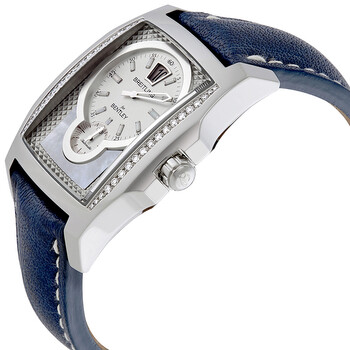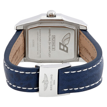 Silver-tone stainless steel case with a blue leather strap. Fixed silver-tone bezel with 38 diamond set. Mother of pearl dial with silver-tone hands and stick hour markers. Hour displayed in window at the 12 o'clock position. minute markers around the outer rim. Dial Type: Analog. Luminescent markers. Date display at the 12 o'clock position. One subdial displaying: small second at the 6 o'clock position. Breitling Calibre 28 Automatic movement, based upon ETA 2892-A2, containing 21 Jewels, bitting at 28800 vph, and has a power reserve of approximately 42 hours. Scratch resistant sapphire crystal. Screw locked crown. Solid case back. Rectangle case shape, case size: 57.3 mm x 38.5 mm, case thickness: 15 mm. Band width: 24 mm. Tang clasp. Water resistant at 100 meters / 330 feet. Functions: date, hour, minute, second. Bentley Series. Luxury watch style. Breitling Bentley Flying B Diamond Automatic Jumping Hour Men's Watch A28362AF-A633BLLT.