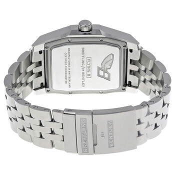 Silver-tone stainless steel case with a silver-tone stainless steel bracelet. Fixed silver-tone stainless steel bezel. Silver dial with skeletal hands and index hour markers. Minute markers around the outer rim. Dial Type: Analog. Luminescent hands and hour markers. Date display at the 12 o'clock position. One subdial displaying: small second. Breitling Calibre 28 Automatic movement, based upon ETA 2892-A2, containing 21 Jewels, bitting at 28800 vph, and has a power reserve of approximately 42 hours. Scratch resistant sapphire crystal. Screw locked crown. Solid case back. Rectangle case shape, case size: 57.30 mm x 38.50 mm, case thickness: 15 mm. Band width: 24-20 mm, band length: 8.5 inches. Deployment clasp. Water resistant at 100 meters / 330 feet. Functions: date, hour, minute, second. Breitling For Bentley Series. Luxury watch style. Watch label: Swiss Made. Item Variations: A2836212, A2836212 B844SS, A2836212.B844. Breitling Bentley Flying B Men's Watch A2836212-B844SS.