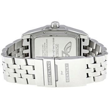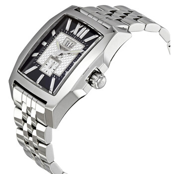 Silver-tone stainless steel case with a silver-tone stainless steel bracelet. Fixed silver-tone stainless steel bezel. Black dial with luminous hands and luminous stick with Roman numeral at 12 o'clock position hour markers. Minute scale around the inner rim. Dial Type: Analog. Luminescent hands and dial markers. Date display at the 12 o'clock position. One subdial displaying: small second. Breitling Calibre 16 Automatic movement, based upon ETA 2892-A2, containing 30 Jewels, bitting at 28800 vph, and has a power reserve of approximately 42 hours. Scratch resistant sapphire crystal. Screw locked crown. Solid case back. Rectangle case shape, case size: 51.40 mm x 34.50 mm, case thickness: 13 mm. Band width: 22 mm, band length: 8.5 inches. Deployment clasp. Water resistant at 500 meters / 1650 feet. Functions: date, hour, minute, second. Bentley Series. Luxury watch style. Watch label: Certifie Chronometre. Item Variations: A1636212. Breitling Bentley Flying B No. 3 Men's Watch A1636212-B881SS.