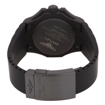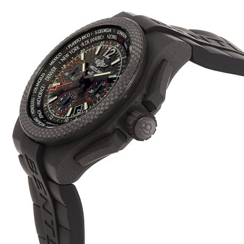Black carbon case with a black rubber strap. Fixed black carbon bezel. Black dial with black hands and index hour markers. Arabic numeral appears at the 12 o'clock position. Minute markers. 24 hour markers. World time cities around the outer rim. Luminescent hands and markers. Date display between the 4 and 5 o'clock positions. Breitling Calibre B04 automatic movement with a 70-hour power reserve. Scratch resistant sapphire crystal. Screw down crown. Solid case back. Round case shape, case size: 45 mm, case thickness: 16 mm. Band width: 22 mm. Deployment clasp. Water resistant at 100 meters / 330 feet. Functions: GMT, second time zone, hour, minute, second. Additional Info: limited to 250. Bentley Gmt B04 Series. Sport watch style. Watch label: Swiss Made. Breitling Bentley GMT B04 Automatic Black Dial Men's Watch NB0434E5/BE94.