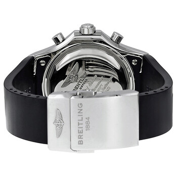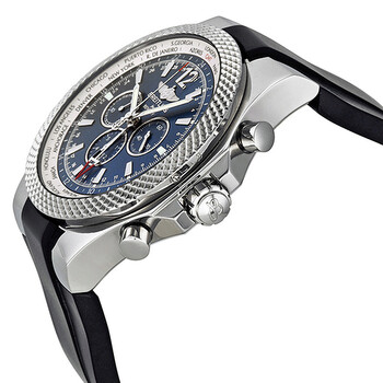 Stainless steel case with a black rubber strap. Bi-directional rotating stainless steel bezel. Blue dial with silver-tone hands and stick hour markers. An Arabic numeral marks the 12 o'clock position. 24 hour markers. Minute markers. Worldtime cities around the outer rim. Dial Type: Analog. Luminescent hands and markers. Date display appears at the 6 o'clock position. Chronograph - three sub-dials displaying: 60 second, 15 minute and 6 hour. Automatic movement. Scratch resistant sapphire crystal. Screw locked crown. Solid case back. Case diameter: 49 mm. Round case shape. Deployment clasp with push button. Water resistant at 100 meters / 330 feet. Functions: GMT, second time zone, chronograph, date, hour, minute, second. Casual watch style. Watch label: Swiss Made. Breitling Bentley GMT Chronograph Automatic Blue Dial Stainless Steel Men's Watch A4736212-C768.