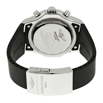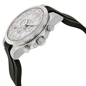 Stainless steel case with a black rubber strap. Bi-directional rotating stainless steel bezel. Silver dial with luminous silver-tone hands and stick hour markers. An Arabic numeral marks the 12 o'clock position. 24 hour markers. Minute markers. World time cities around the outer rim. Dial Type: Analog. Luminescent hands and markers. Date display appears at the 6 o'clock position. Chronograph - three sub-dials displaying: 60 second, 15 minute and 6 hour. Breitling calibre 47B automatic movement with a 48-hour power reserve. Scratch resistant sapphire crystal. Screw locked crown. Solid case back. Case size: 49 mm. Round case shape. Band width: 30 mm. Deployment clasp with a push button release. Water resistant at 100 meters / 330 feet. Functions: GMT, second time zone, chronograph, date, hour, minute, second. Casual watch style. Watch label: Swiss Made. Breitling Bentley GMT Chronograph Automatic Men's Watch A4736212/G657.