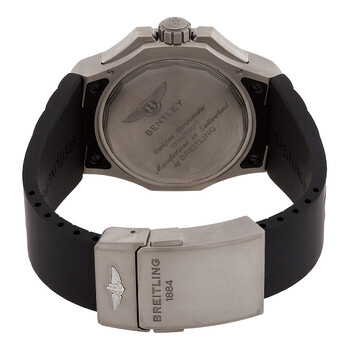 Grey titanium case with a black (bentley ii) rubber strap. Bi-directional rotating grey titanium bezel. Storm silver dial with silver-tone hands and index hour markers. Arabic numeral appears at the 12 o'clock position. Minute markers. 24 hour markers. Minute markers. World time cities around the outer rim. Dial Type: Analog. Luminescent hands and markers. Date display between the 4 and 5 o'clock positions. Chronograph - three sub-dials displaying: 60 second, 30 minute and 12 hour. Breitling Calibre 04 Automatic movement, based upon Breitling Calibre 01, containing 47 Jewels, bitting at 28000 vph, and has a power reserve of approximately 70 hours. Scratch resistant sapphire crystal. Screw locked crown. Solid case back. Round case shape, case size: 45 mm. Deployment clasp. Water resistant at 100 meters / 330 feet. Functions: GMT, second time zone, hour, minute, second, date, chronograph. Bentley Gmt Series. Luxury watch style. Watch label: Swiss Made. Breitling Bentley GMT Chronograph Automatic Men's Watch EB043335/G801.