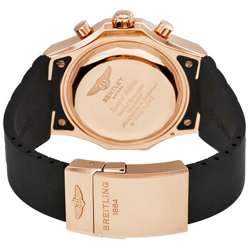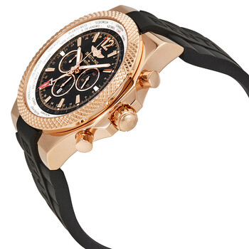 18kt rose gold case with a black rubber strap. Bi-directional rotating 18kt rose gold bezel. Black dial with rose gold-tone hands and index hour markers. Minute markers. 24 hour markers. World time cities around the outer rim. Dial Type: Analog. Luminescent hands and markers. Chronograph - three sub-dials displaying: 60 second, 6 hours and 15 minutes. Breitling calibre 47B automatic movement. Scratch resistant sapphire crystal. Screw locked crown. Solid case back. Case size: 49 mm. Case thickness: 16 mm. Round case shape. Band width: 30 mm. Deployment clasp. Water resistant at 100 meters / 330 feet. Functions: chronograph, date, hour, minute, second, GMT. Luxury watch style. Watch label: Swiss Made. Breitling Bentley GMT Chronograph Men's Watch R4736212-B934BKRD.
